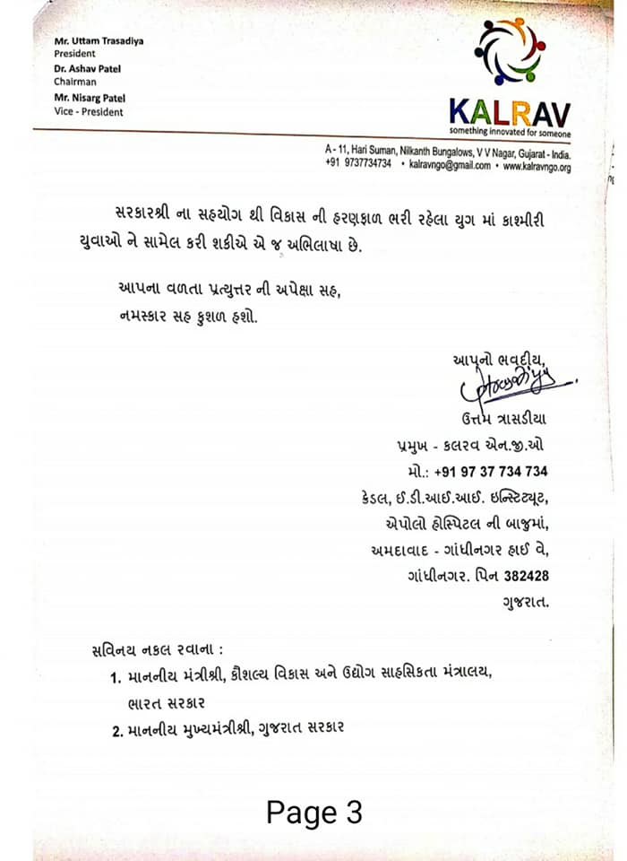 Mr. Uttam Trasadiya wrote a latter to PM Shri Narendra Modi to iniatiate Skill Development Centre in JK.